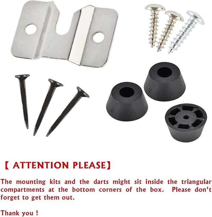 • 💯4 complete sets of high quality 18g steel darts with strong Aluminum shafts and flights. Dartboard mounting kits are also included. (please check the bottom corner of the box for all accessories)
