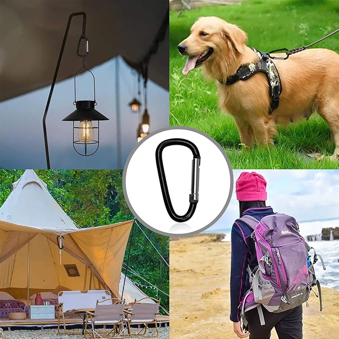 • 【Design】-Black Aluminum Caribeener Clips, Silver Steel Ring. Spring-Loaded Closing Gate Makes it smoothly to open and close. Coloring through an oxidation process, which makes it very difficult to fade/rust, except scratching.