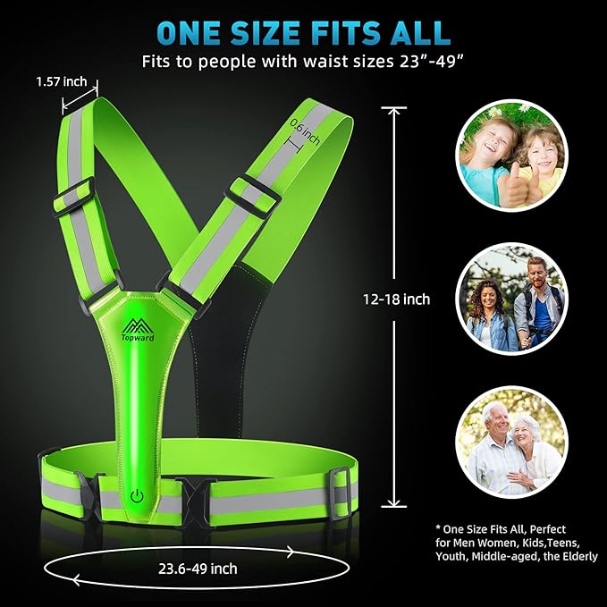• COMFORTABLE & ELASTIC & ADJUSTABLE - The ergonomic design of this LED reflective vest ensures your comfort when you wear it over any dress typically t-shirt, sports gear, jacket as per the season. Waist circumference expands from 23" to 49"; Shoulder strap: 12 - 26 inch; perfect gift for men/women/kids/teens/the elderly