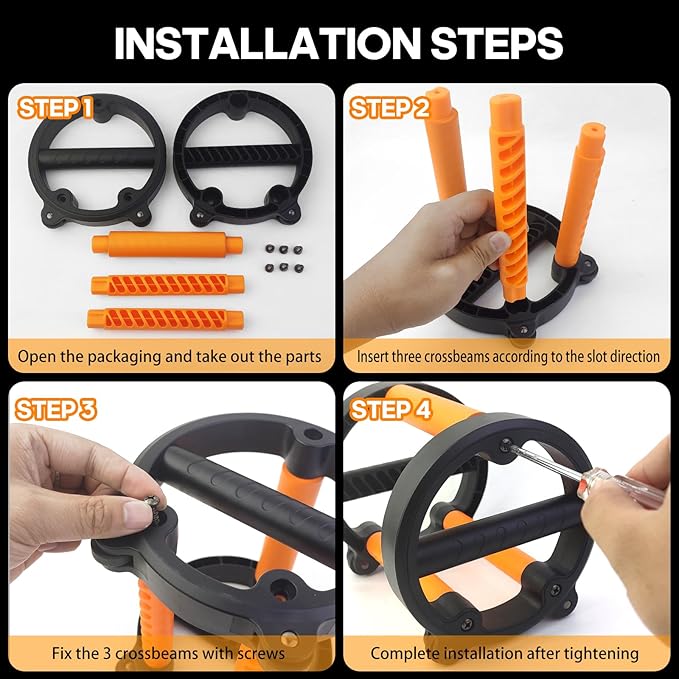 • AB Roller and Push Up Bars - 2-in-1 Abdominal Exercise with ergonomic design, offers stronger support and sturdiness. Push up roller wheel greatly enhance the stability. Solid rubber wheel, it rolls well and quietly.