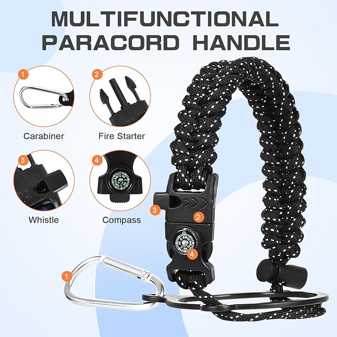 • Full-function Paracord - With brilliant matching colors brings a touch of youthful vibe to the jugs. As a sturdy survival handle it comes with a carabiner, compass, fire starter and whistle, perfect for your wild adventures.