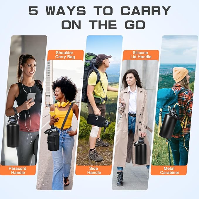 • What You Get - GAZLEMHO 128oz insulated water bottle, and 7 accessories: 2-in-1 lid, paracord handle, carrying pouch with strap, protective silicone boot, 2 straws, straw brush. And lifetime warranty.