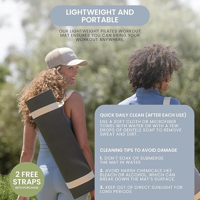 • EFFORTLESSLY PORTABLE: Our lightweight pilates workout mat ensures you can bring your workout anywhere. Included with your purchase are 2 storage straps, making transport and storage a breeze, for fitness that follows you