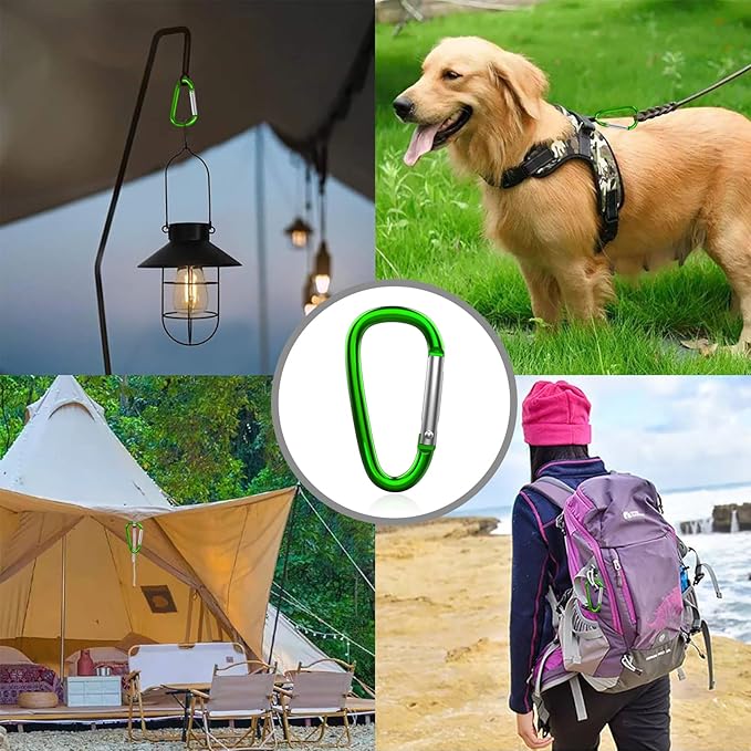 • 【Design】-Green Aluminum Caribeener Clips, Silver Steel Ring. Spring-Loaded Closing Gate Makes it smoothly to open and close. Coloring through an oxidation process, which makes it very difficult to fade/rust, except scratching.