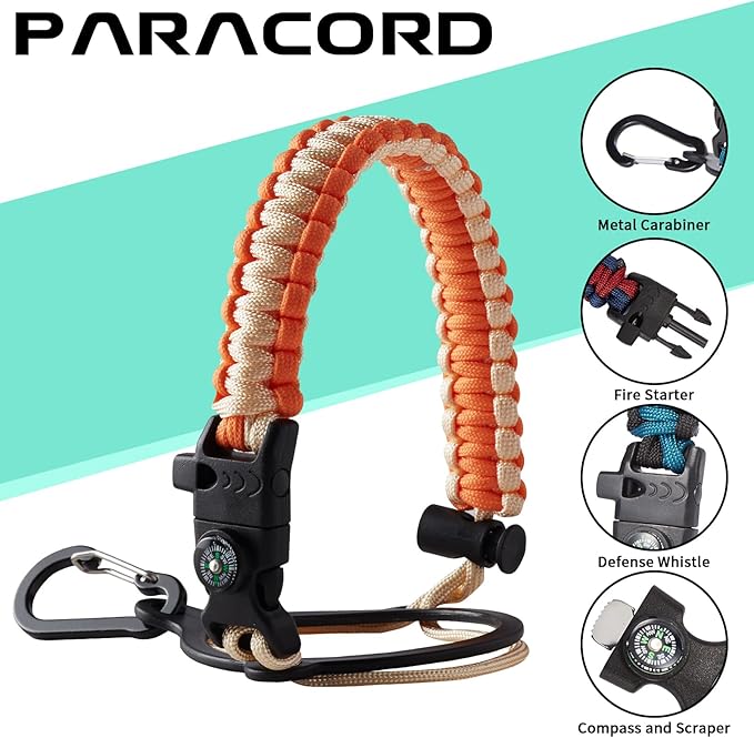 - UNIQUE PARACORD HANDLE: Bright color paracord matches the flask water bottle to give you a youthful vibe while adding a personal style. With a compass, safety loop, metal carabiner, flint, igniter and whistle to become your survival tool, making the 32 oz stainless steel water bottle with paracord an ideal survival kit for expeditions in the wild