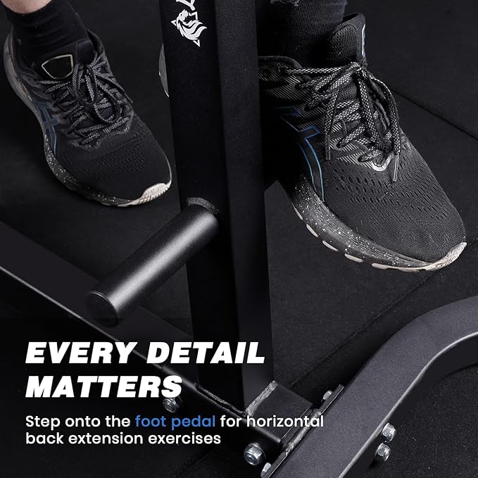 - Dual Ankle Rollers: Our Roman Chair is equipped with ankle rollers and sturdy steel footplate, providing a snug fit and stable support during back extensions. The ankle rollers feature a premium PU leather surface and come with foam cushioning, ensuring comfortable and secure fixation of your ankles for enhanced stability during your workout. Explore angles confidently with safe training on our Roman Chair. Enhance workouts effectively, boosting your training experience
