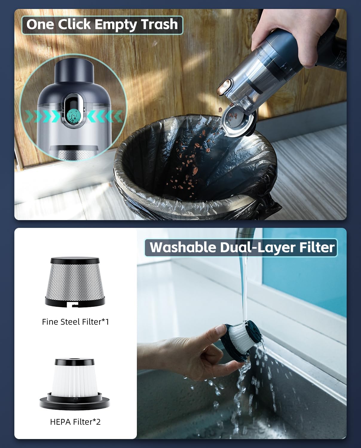 - Car Vacuum Rechargeable: This mini car vacuum has a built-in 4000 mAh rechargeable battery, ultra-high capacity can provide max twenty min of continuous cleaning power after four hours full charging. Portable car vacuum cleaner with 0.1 L large capacity dustbin, press the button to open the dustbin, do not need to disassemble greatly saving time and the reusable HEPA double filter is washable and air-dried, and bring you a joyful cleaning experience