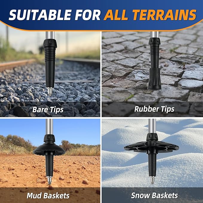 - PERFECT SERVICE: Each purchase includes 2 rubber tips, 2 snow baskets and 2 mud baskets to ensure seamless adaptation to snow, mud, uneven terrain and more. Lightweight and durable, these replacement tips will keep your hiking poles ready for any trail condition, so you never have to stop your trek. All products are covered by a one-year warranty against defects in materials and workmanship