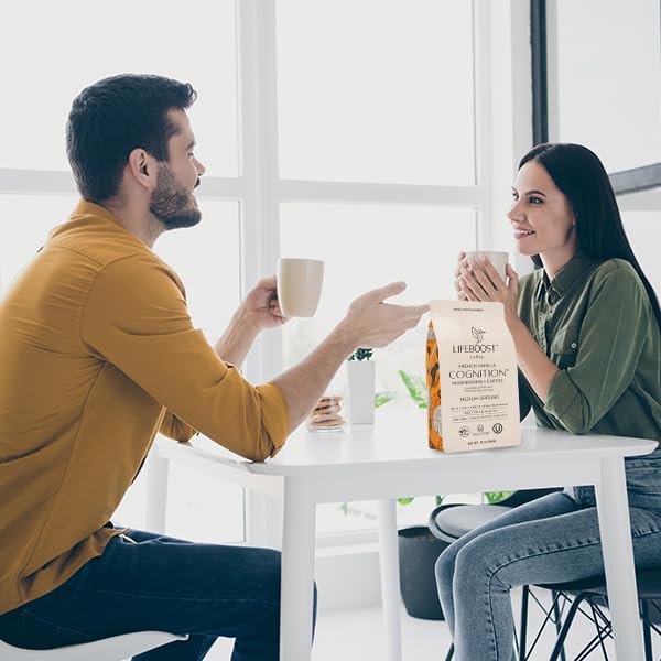 Lifeboost French Vanilla Cognition Mushroom Coffee - Low Acid Medium Organic Coffee with Nootropic Lions Mane & Chaga Mushrooms - Increase Energy, Boost Focus & Immune Support - 12 oz Bag - Ground