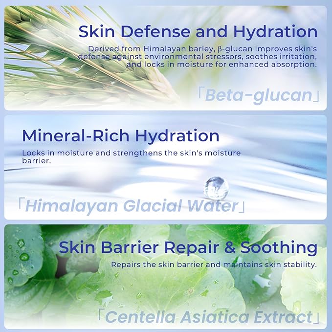 - Skin Defense and Hydration: Derived from Himalayan barley, ฮฒ-glucan improves skin's defense against environmental stressors, soothes irritation, and locks in moisture for enhanced absorption.