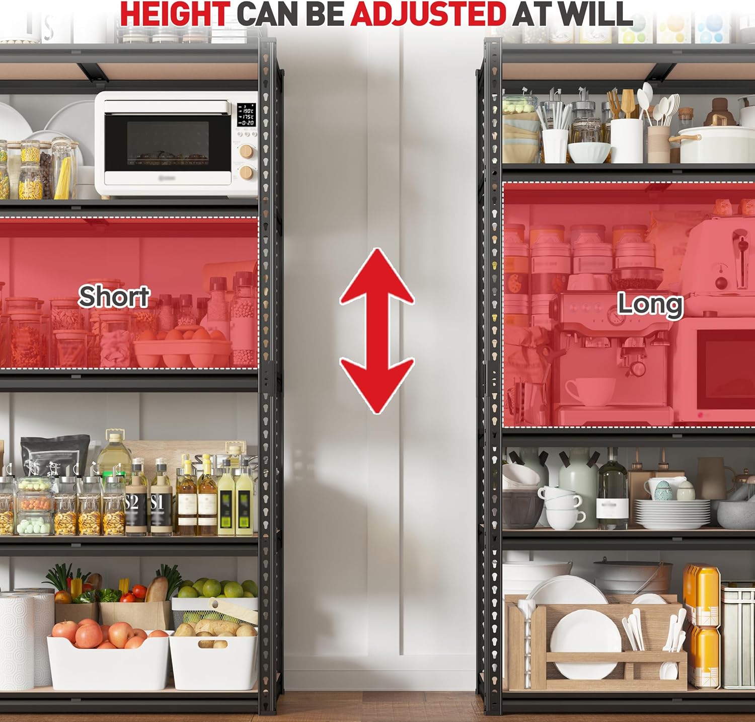 - 【Adjustable Shelving Unit with Customizable Space】Easily adjust each shelf height by moving the crossbar up or down to accommodate different items. The connector allows you to divide a shelf into two separate parts to serve as workbench