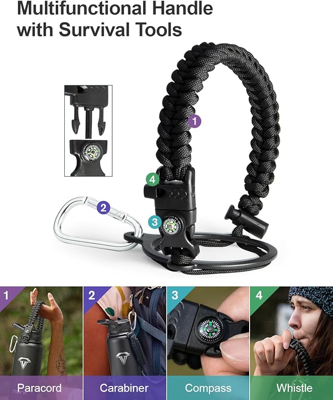 - Ready for adventures: Topre 32oz water bottles include a paracord handle,it is crafted from sturdy braided rope with an attached survival kit. This includes a compass, a whistle, and a clip, making it an ideal companion for any outdoor activity β be it camping,hiking or exploring new places through travelling.