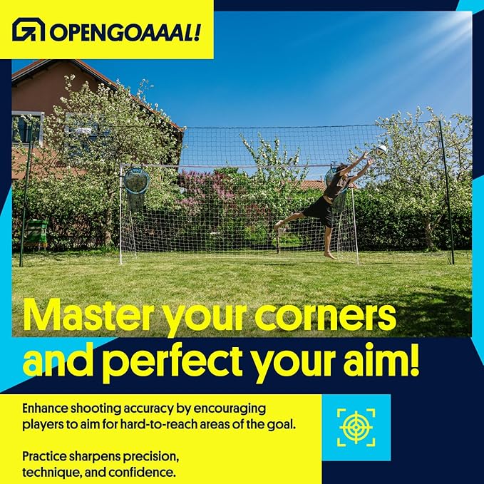 - Precision Soccer Training: Boost your skills with the Open Goaaal Corner Targets, perfect for challenging shots and mastering those hard-to-reach areas. Regular practice with these soccer goal hanging targets enhances your accuracy, technique, and confidence. Only compatible with grass and please check your yard dimensions before ordering