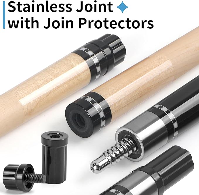 • Professional Pool Cue: Kmise 58-inch 2-piece detachable pool cue, weight 19OZ, made of high-quality Canadian hard rock maple, stainless steel joints, sturdy and durable and not easy to deform