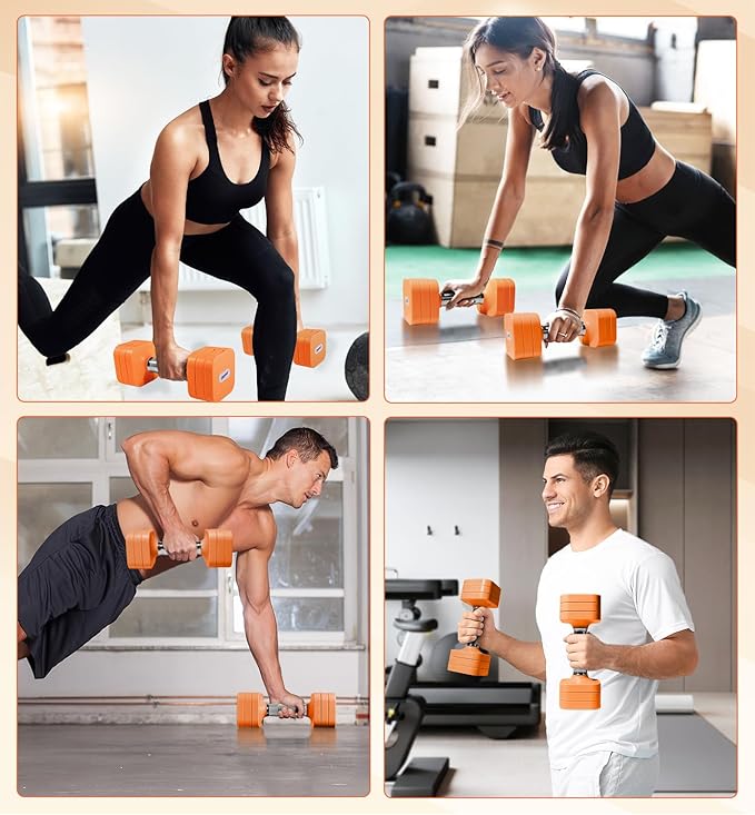 • The dumbbell weights set are square and not round. The square shape keeps them from rolling around on the floor or shelf. The handle boasts anti-slip strips to provide better gripping.