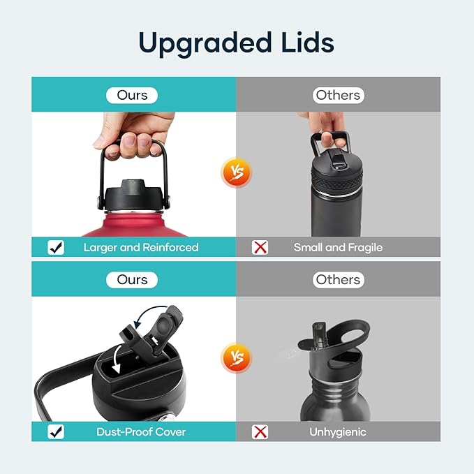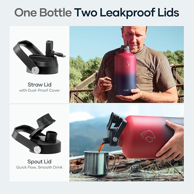 • 2 Caps Pack: This 128 oz stainless steel water bottle comes with straw lid and flex cap, the flex cap is perfect for the beach, camping and hiking, while the straw lid is suitable for cycling and road trip