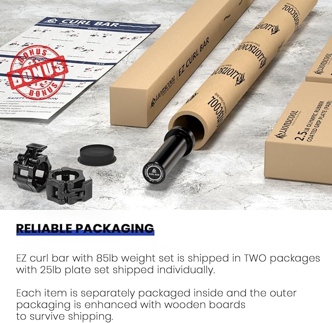 - Reliable Packaging & Warranty: The whole set is shipped in two tough packages with inside each item separately packaged and EZ curl bar is double packaged with sturdy tube and thick cardboard box. The pair of 25lb plates is shipped separately. Please note that the two packages may not arrive at the same time. We offer lifetime warranty on our EZ curl bar and one-year warranty on the weight plates.