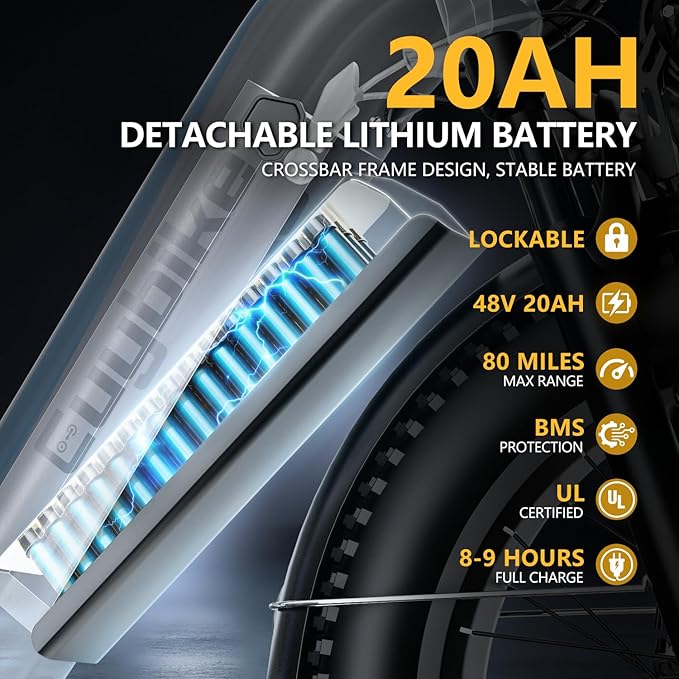 - ๐๐๐ ๐๐๐๐ก ๐๐จ๐ง๐ ๐๐๐ง๐ ๐ ๐๐๐ฆ๐จ๐ฏ๐๐๐ฅ๐ ๐๐๐ญ๐ญ๐๐ซ๐ฒ:Not only the excellent motor but also an upgraded battery equipped. The 48V 20Ah lithium-ion battery covers a range of 60-100 miles per full charge. The removable battery design makes charging more convenient. Dustproof and dampproof, guarantee the safety and life of the battery. Effortlessly cruise, exercise, or commute seamlessly with this long range e-bike.