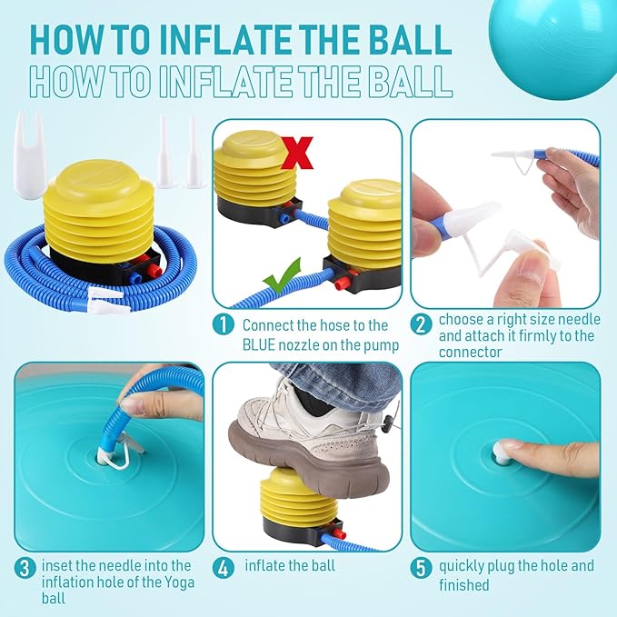 • Various Colors: you will receive 4 pieces of exercise balls for working out in turquoise color, equipped with 1 piece of foot pump, 1 piece of air pull, and 2 pieces of air plugs; The complete set can meet your exercise needs