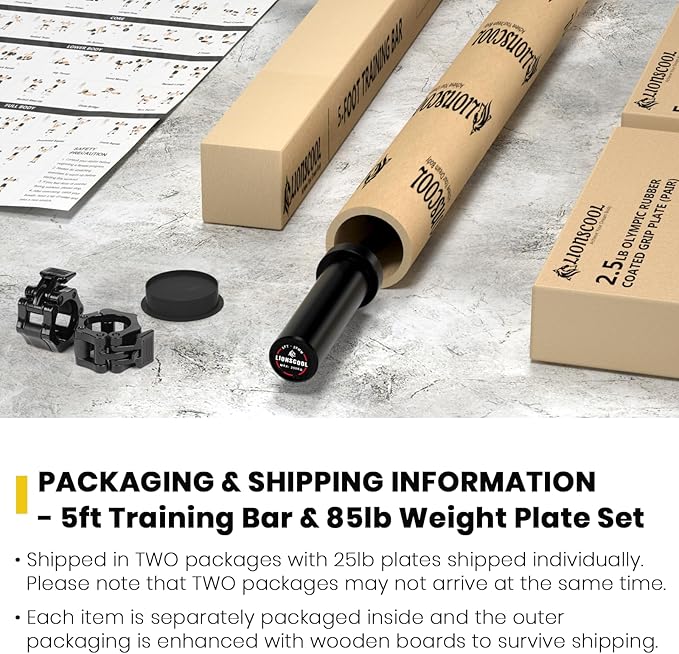 - All In One Kit to Meet Your Needs: Weโre dedicated to providing convenient and effective workout solutions for all. Get this 4.9ft training bar and weight plate set. It is perfect for daily strength training and bodybuilding exercises that can be performed without the need of a power cage. Shipped in TWO packages, this set includes a 4.9ft training barbell and pairs of 2.5lb, 5lb,10lb and 25lb 2-inch rubber coated Olympic weight plates, all the plates totaling 85 pounds. Please notice the pair of 25lb plates is shipped separately. Barbell clamps are included.