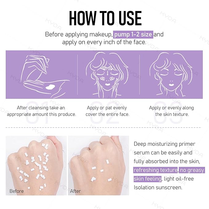 - REFRESHING FORMULA - Before applying makeup, pump 1-2 size and apply on every inch of the face. Deep moisturizing primer serum can be easily and fully absorbed into the skin, refreshing texture, no greasy skin feeling, light oil-free Isolation sunscreen.