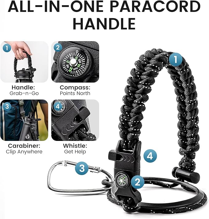 - Adventure Ready Paracord Handle: RAYMYLO 1/4 gallon water jug features a stylish color-coordinated paracord handle with a built-in compass and carabiner clip. This reusable water bottle's paracord handle is lightweight, durable, and perfect for hands-free carrying during hikes, cycling, or camping. Grab & go for spontaneous adventures under the stars!
