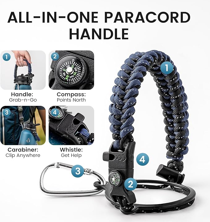 - Adventure Ready Paracord Handle: RAYMYLO 1 gallon water jug features a stylish color-coordinated paracord handle with a built-in compass and carabiner clip. This reusable water bottle's paracord handle is lightweight, durable, and perfect for hands-free carrying during hikes, cycling, or camping. Grab & go for spontaneous adventures under the stars!