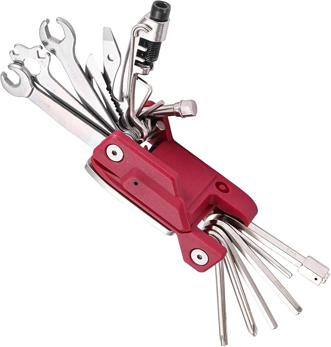• 21 in 1 Multi-Function Tool Kits: hex key (2/2.5/3/4/5/6/8/10mm)*1,phillips screwdriver PH2*1,torx key T25 *1,wrench 0.59 in(15mm),mini pedal wrench 0.31/0.35/0.39 in(8/9/10mm)*1,wrench 0.31/0.39 in(8/10mm)*1,bottle opener*1,chain hook *1,chain riveter*1,knife *1,tire iron & air valve punch *1,spoke spanner 14g/15g & ring wrench 0.35 in(9mm)*1,screwdriver(flat head) & chain pin tool*1,storage compartment for chain pins*1,tire iron *1,locking button *1,locking bracket *1.