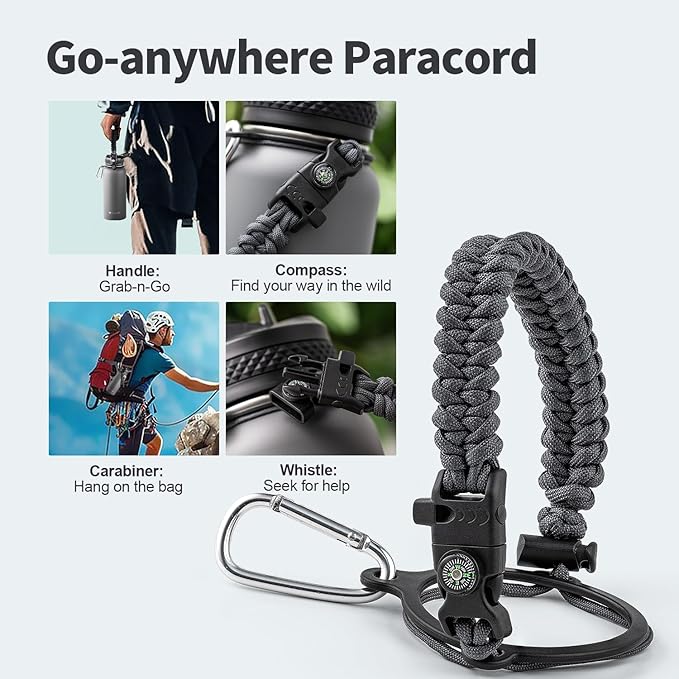 - Palm Fitting Paracord Handle: Compared to handle lids, nylon paracord on the bottle gives you more choices in terms of color coordination and coziness on your hands. Match the handle with your bottle to make a complete outdoorsy look. Compass and carabiner can be lifesavers for hiking and other expeditions