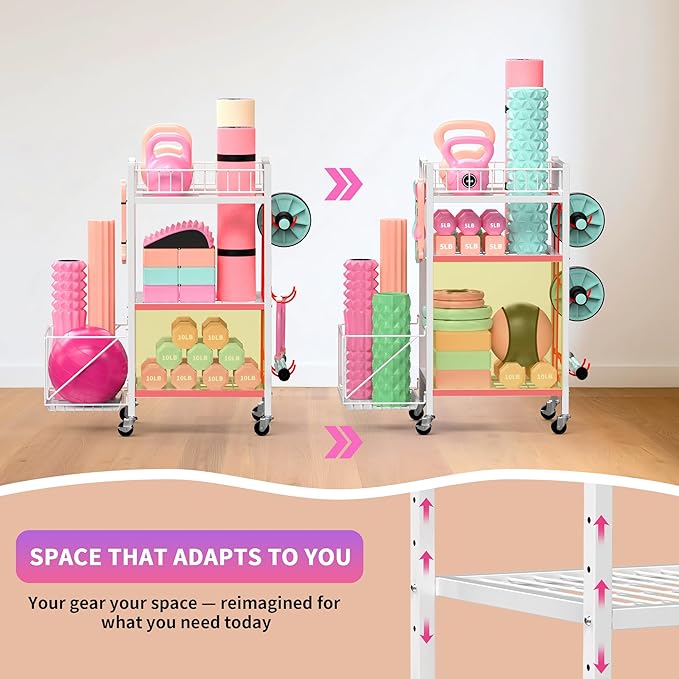 - [Adjustable & All-in-One Storage Solution]: This weight rack for home gym features an adjustable height design, allowing you to customize the spacing for different items like yoga mats, foam rollers, dumbbells, kettlebells, and resistance bands. With 3 tiers, side basket, and multiple hooks, this home gym storage rack keeps all your workout gear organized in one compact place.