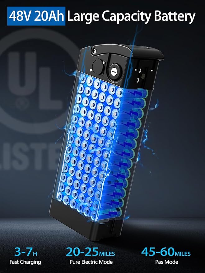 - Certified Lithium Battery: The 48 V 20 Ah, removable battery of our adult foldable e-bike is UL 2849 certified. This foldable electric bikes for adults can travel up to 30 miles in electric-only mode and 60 miles in PAS mode