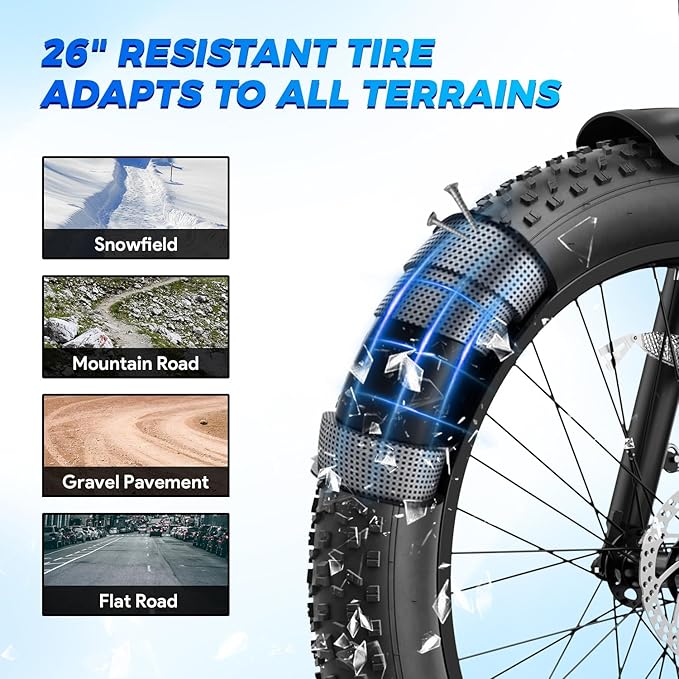 - 【ENJOY A SMOOTHER RIDE】The M2 Pro fat tire electric bike features an eMTB frame and 26'' x 4.0'' fat tire, these are designed for off-road cycling and provide excellent traction and stability on various surfaces. Additionally, its integrated button design allows for convenient control, while including front and rear lights and horn ensuring maximum visibility and safety when riding at night.